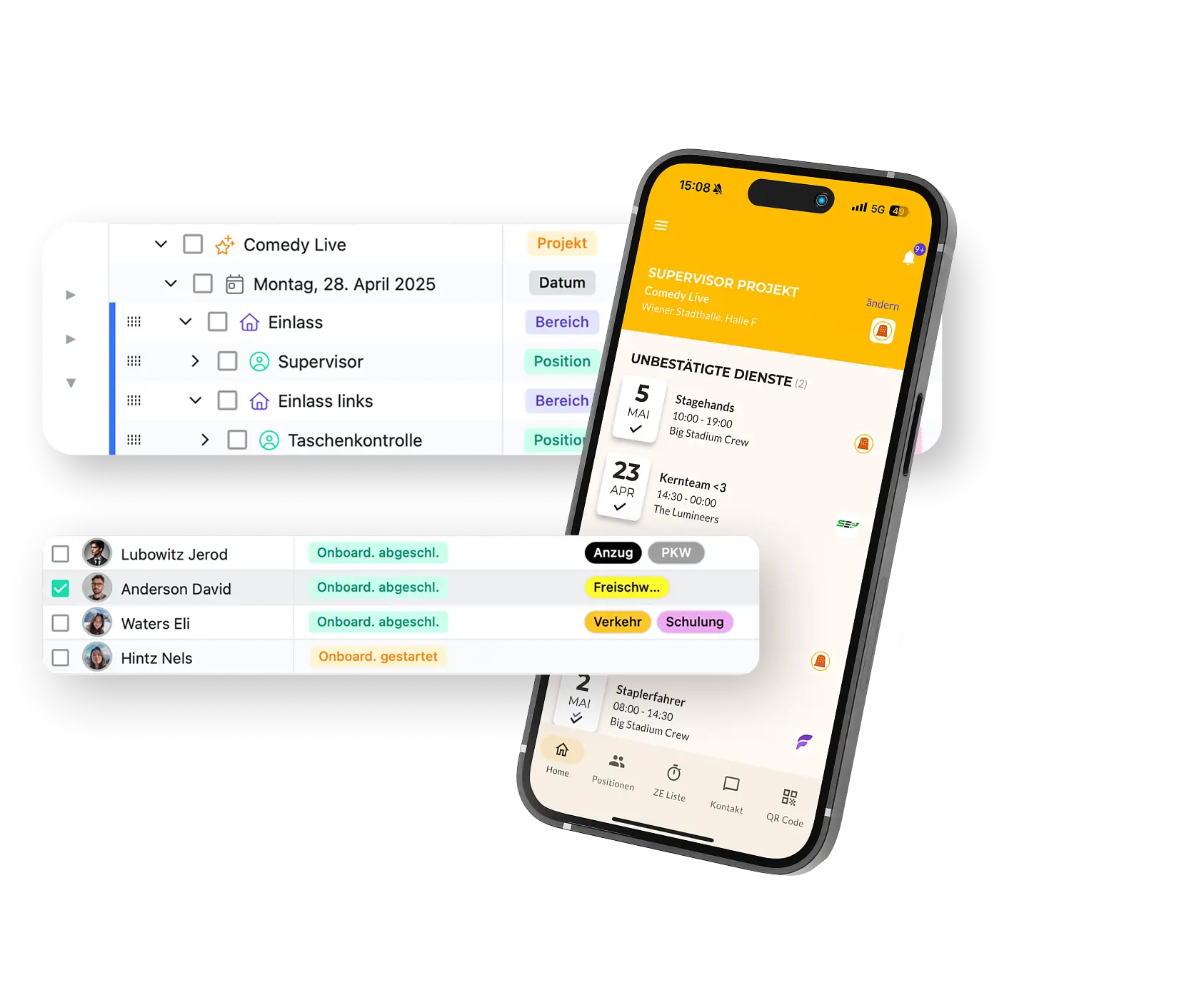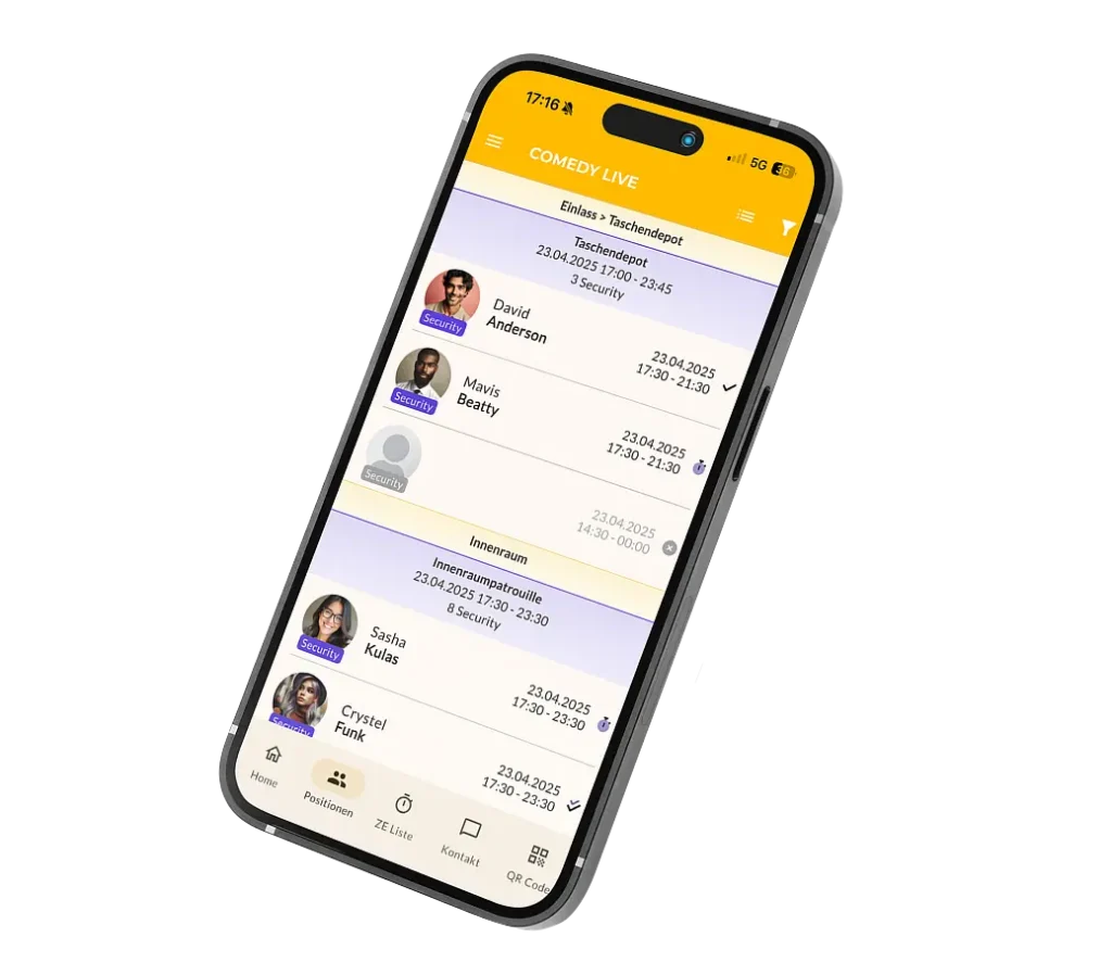 Der Supervisor-Modus bietet Einsatzleitungen volle Kontrolle direkt vor Ort. Berechtigte Supervisor sehen alle ihnen zugewiesenen Mitarbeitenden, Positionen und Dienste in Echtzeit und können Zeiterfassungen sowie Statusmeldungen unmittelbar verwalten.