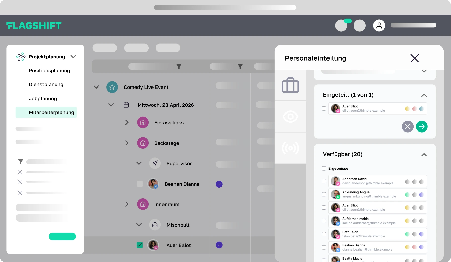 In der Personaleinteilung teilen Disponenten verfügbare Mitarbeitende auf zu besetzende Dienste ein. Flagshift zeigt übersichtlich, wer sich beworben hat, wer verfügbar ist und welche Anforderungen erfüllt sind.