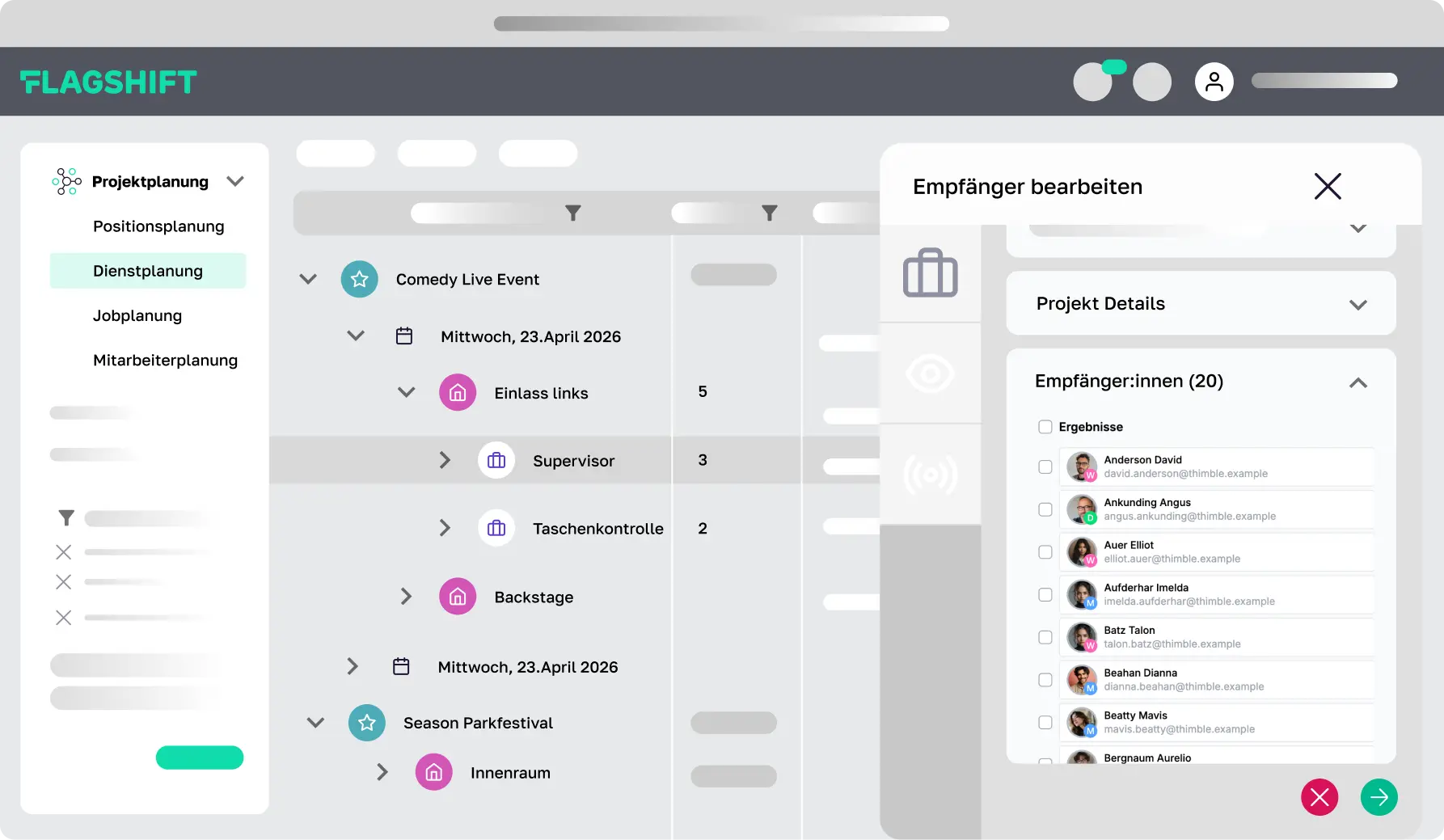 Flagshift bildet die gesamte Planungskette Ihrer Personaleinsätze ab, von Kundenaufträgen über einzelne Projekte bis hin zu Einsatzorten. So behalten Projektleiter den Überblick über Aufgaben, Zeiten und Anforderungen, noch bevor die konkrete Personaleinteilung beginnt.